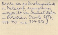 , Rękopis [Handschrift im Besitz der ev. Kirchengemeinde zu Matzdorf, auszugsweise mitgeteilt von Samuel Weber in Protestáns Szemle 1896, 446-453 und 504-513.]