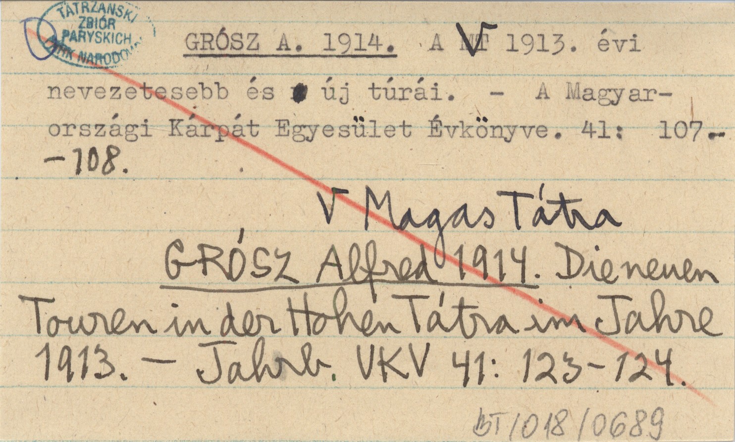A Magyarországi Kárpát Egyesület Évkönyve, 41: 107-108. GRÓSZ Alfred 1914. Die neuen Touren in der Hohen Tátra im Jahre 1913. - Jahrb. UKV 41: 123-124.