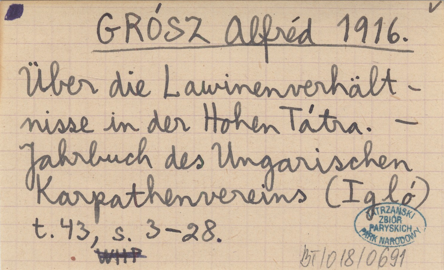 GRÓSZ Alfréd 1916 Über die Lawinenverhältnisse in der Hohen Tátra.