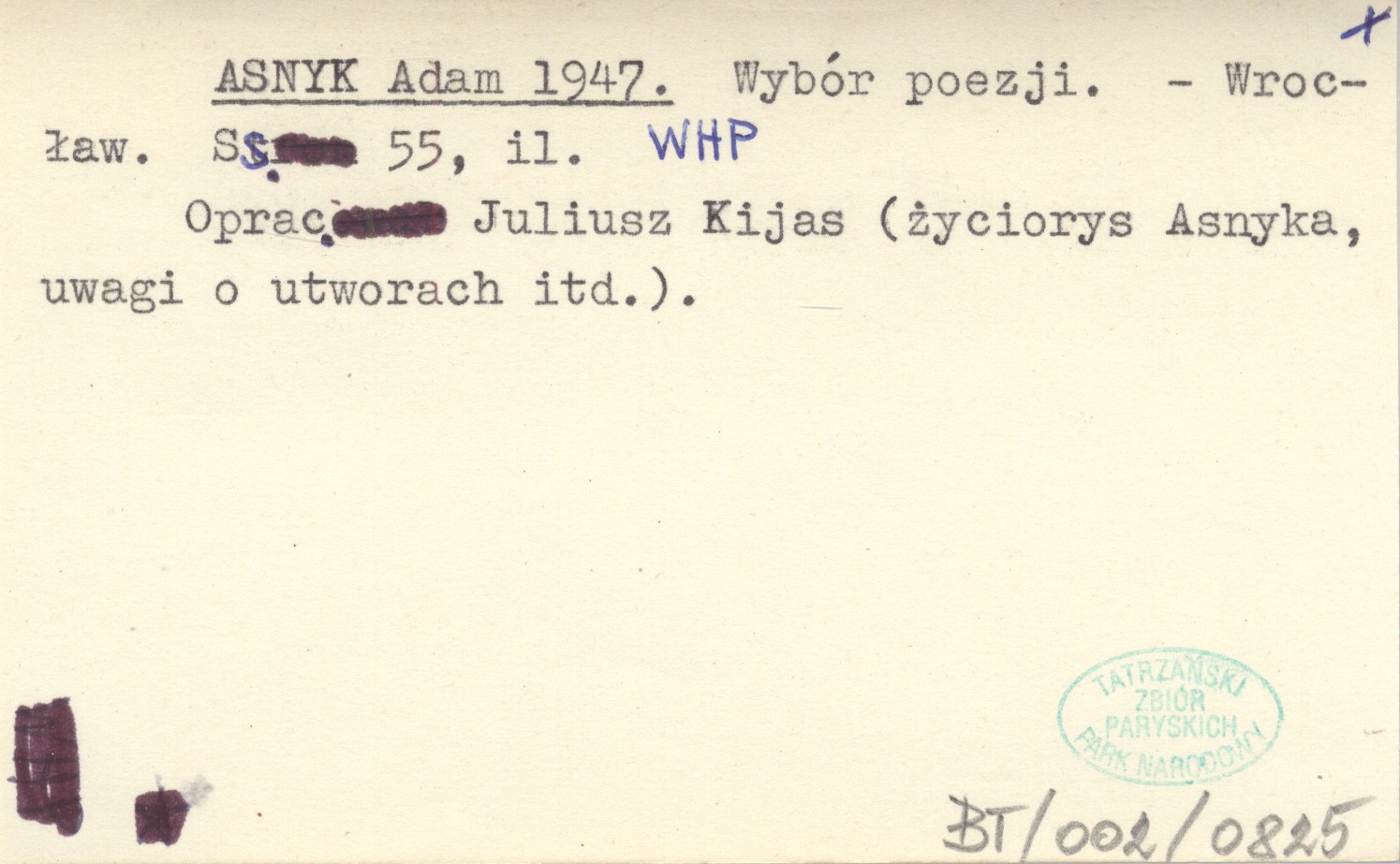 Wrocław , 55 s., il. Oprac. Juliusz Kijas (życiorys Asnyka, uwagi o utworach itd.).