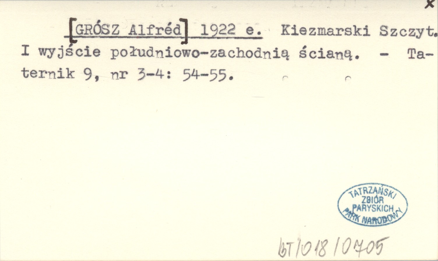 [GRÓSZ Alfréd] 1922 e Kiezmarski Szczyt. I wyjście południowo-zachodnią ścianą.