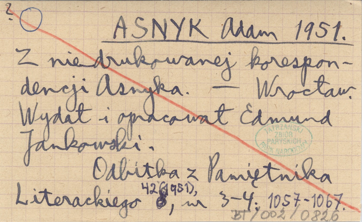 ASNYK Adam 1951 Z niedrukowanej korespondencji Asnyka.