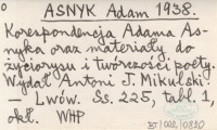 ASNYK Adam 1938 Korespondencja Adama Asnyka oraz materiały do życiorysu i twórczości poety. Wydał Antoni J. Mikulski.