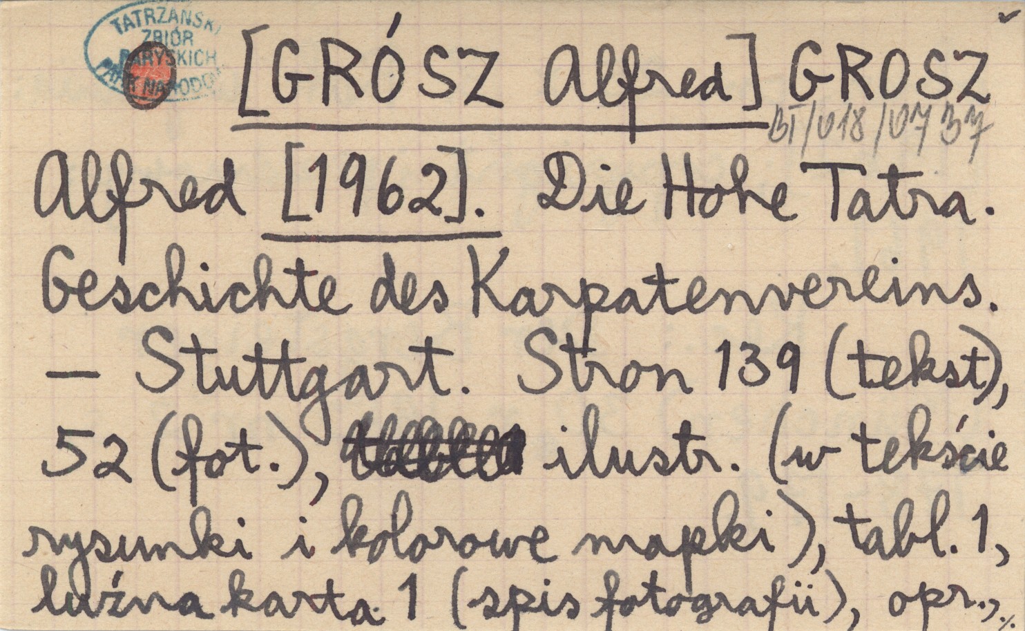GROSZ Alfred [GRÓSZ Alfred] [1962] Die Hohe Tatra. Geschichte des Karpatenvereins.