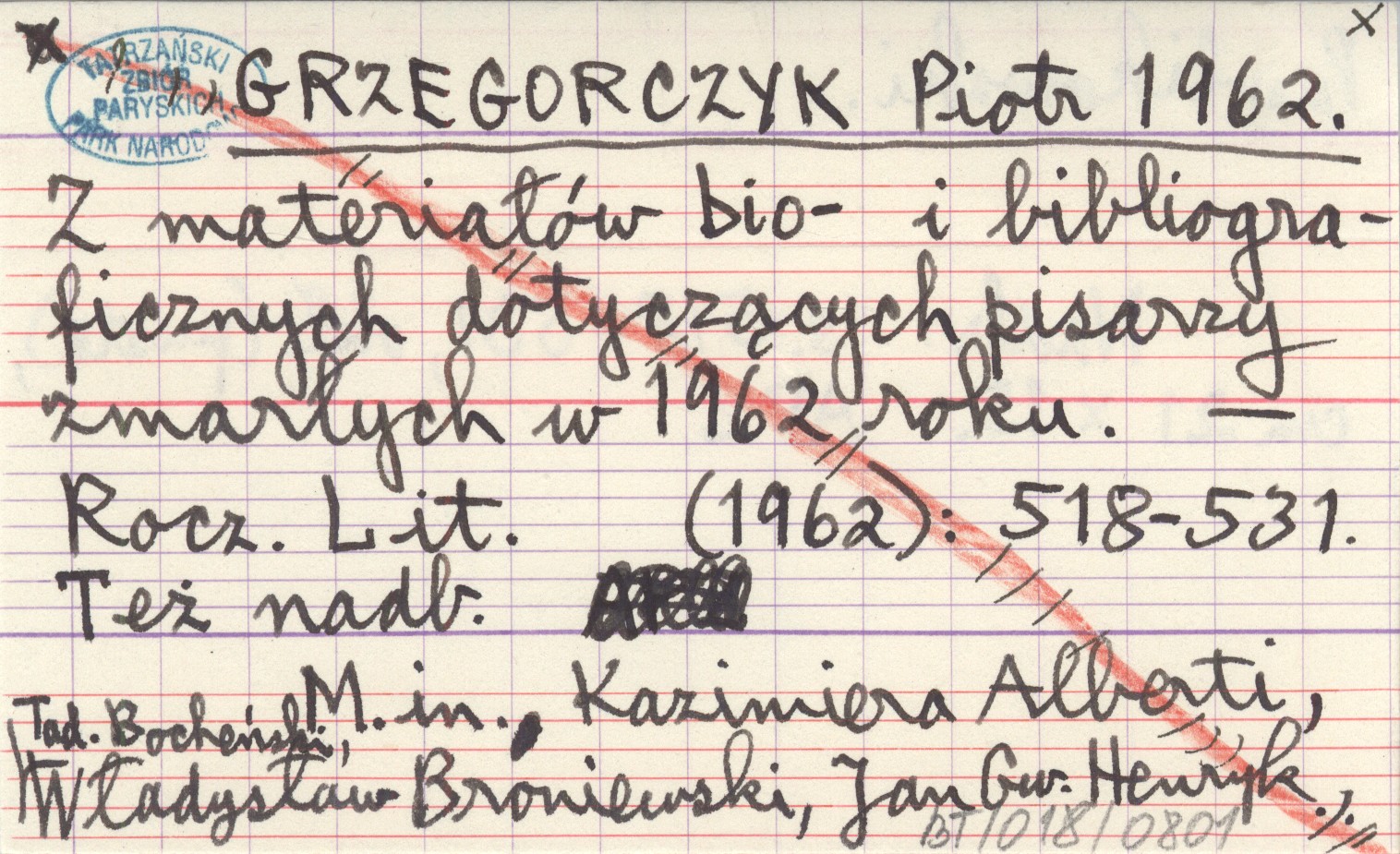 GRZEGORCZYK Piotr 1962 Z materiałów bio- i bibliograficznych dotyczących pisarzy zmarłych w 1962 roku.