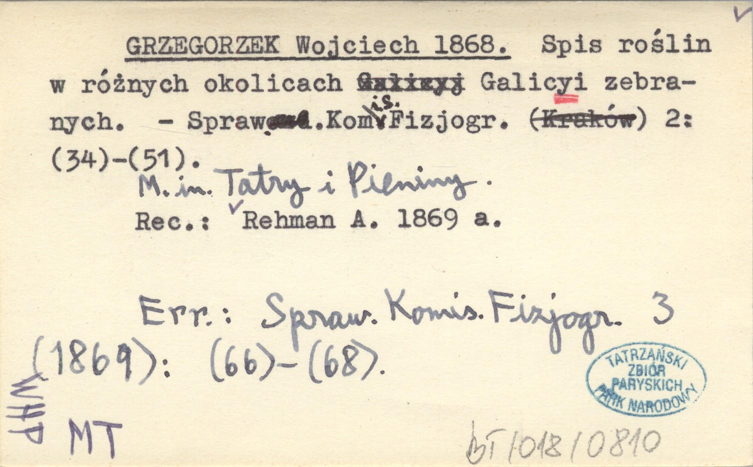 Sprawozdanie Komisji Fizjograficznej, 2: (34)-(51). M.in. Tatry i Pieniny. Err.: Sprawozdanie Komisji Fizjograficznej 3 (1869): (66)-(68). REC: REHMAN A. 1869 a