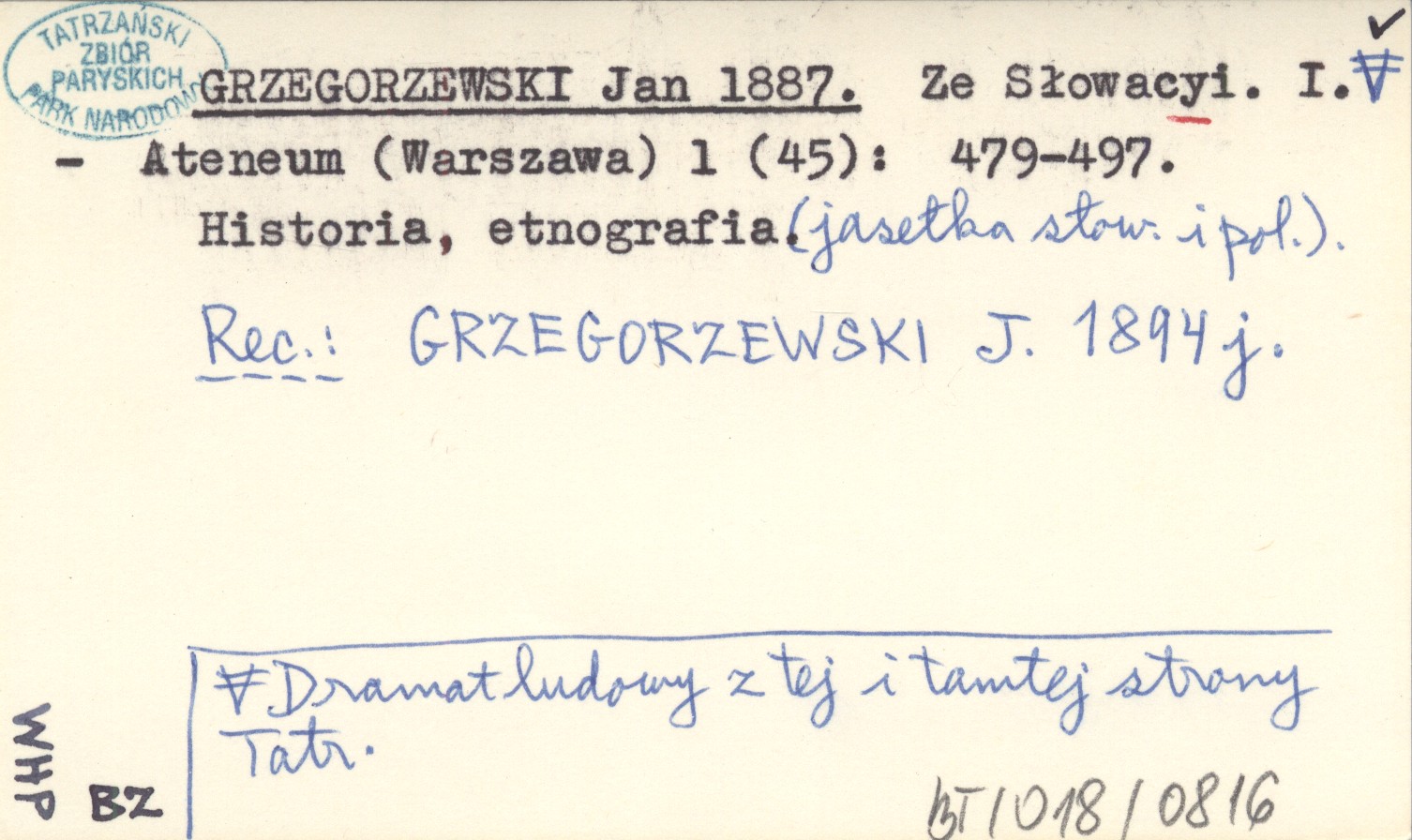 GRZEGORZEWSKI Jan 1887 Ze Słowacyi. I. Dramat ludowy z tej i tamtej strony Tatr.