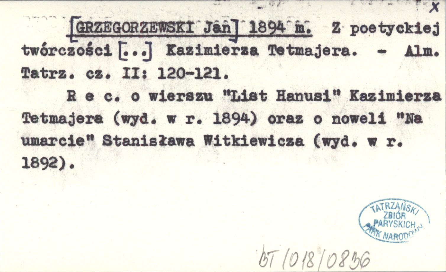 Almanach Tatrzański, Cz. II: 120-121. Rec. o wierszu "List Hanusi" Kazimierza Tetmajera (wyd. w r. 1894) oraz o noweli "Na umarcie" Stanisława Witkiewicza (wyd. w r. 1892).