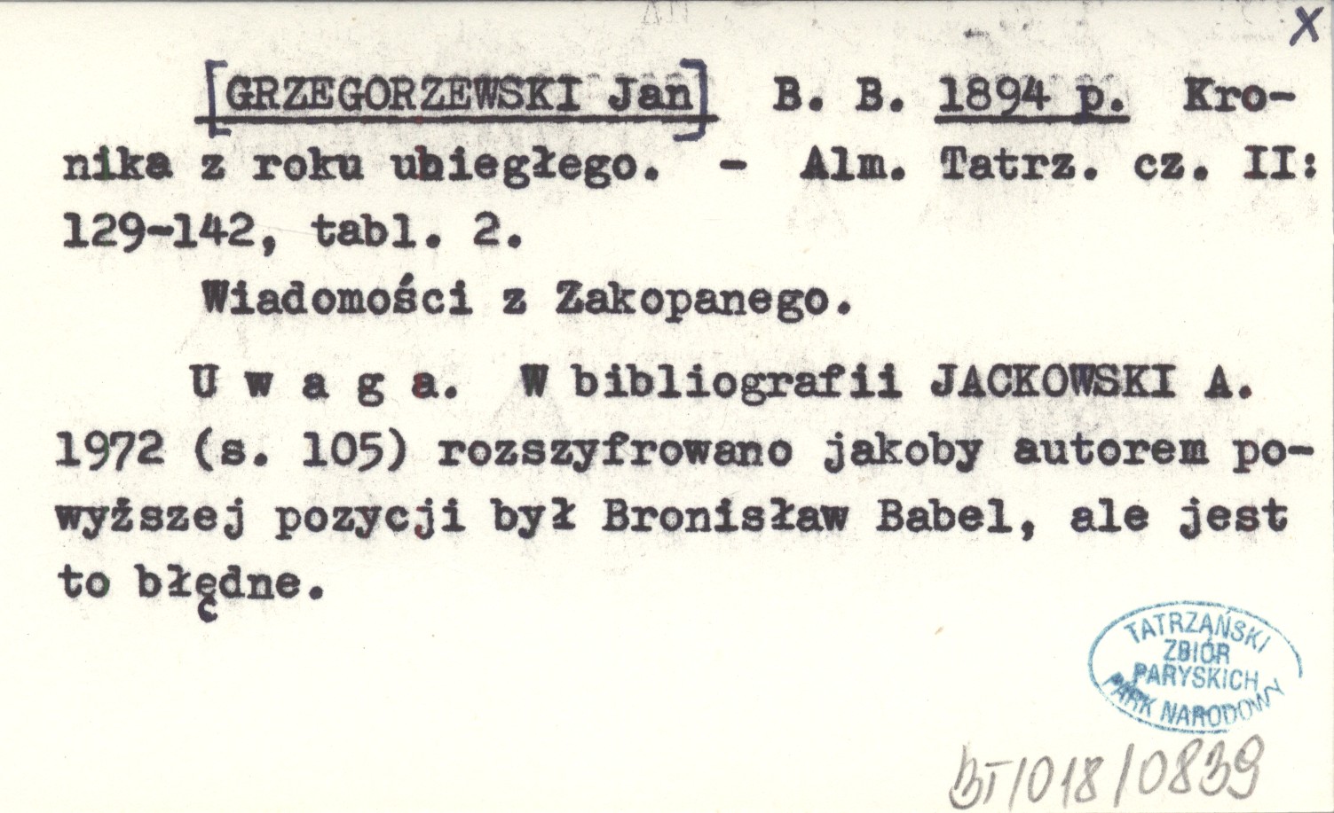 Almanach Tatrzański, Cz. II: 129-142, 2 k. tabl. Wiadomości z Zakopanego. Uwaga. W bibliografii JACKOWSKI A. 1972 (s. 105) rozszyfrowano jakoby autorem powyższej pozycji był Bronisław Babel, ale jest to błędne.
