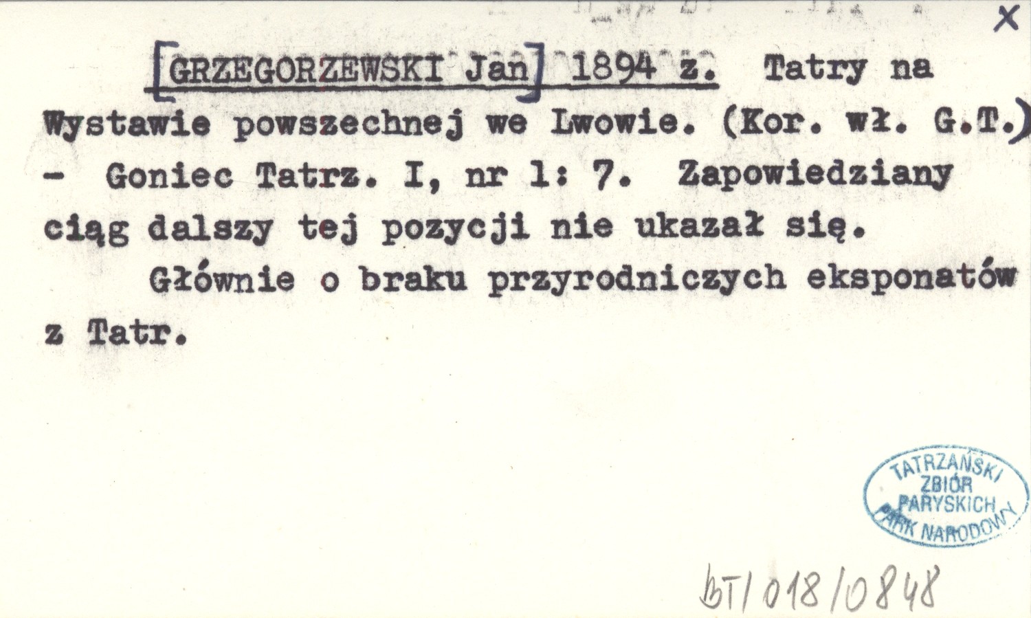 [GRZEGORZEWSKI Jan] 1894 z Tatry na Wystawie powszechnej we Lwowie. (Kor. wł. G.T.).