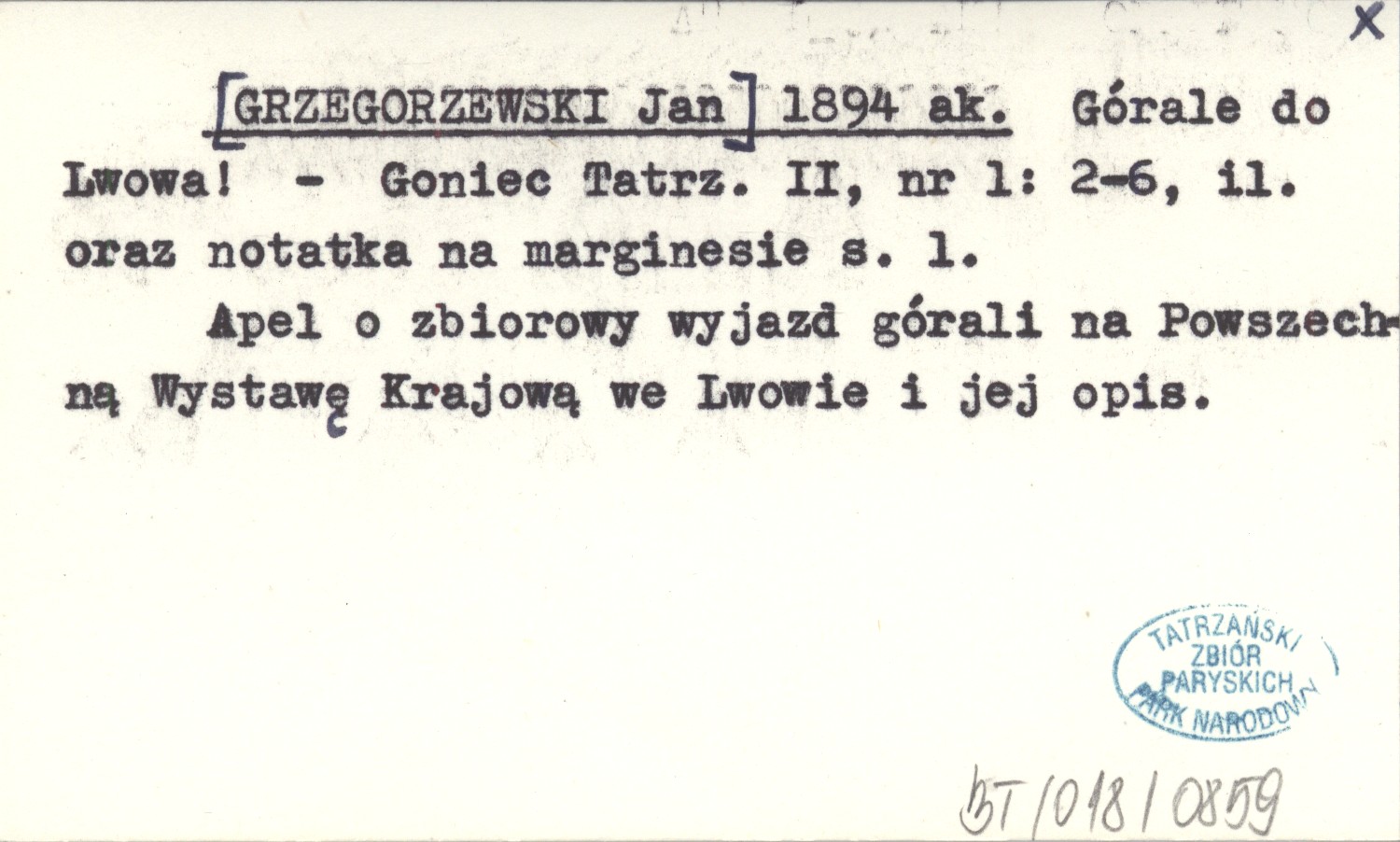 Goniec Tatrzański, 2, nr 1: 2-6, il. Apel o zbiorowy wyjazd górali na Powszechną Wystawę Krajową we Lwowie i jej opis. notatka na marginesie s. 1.