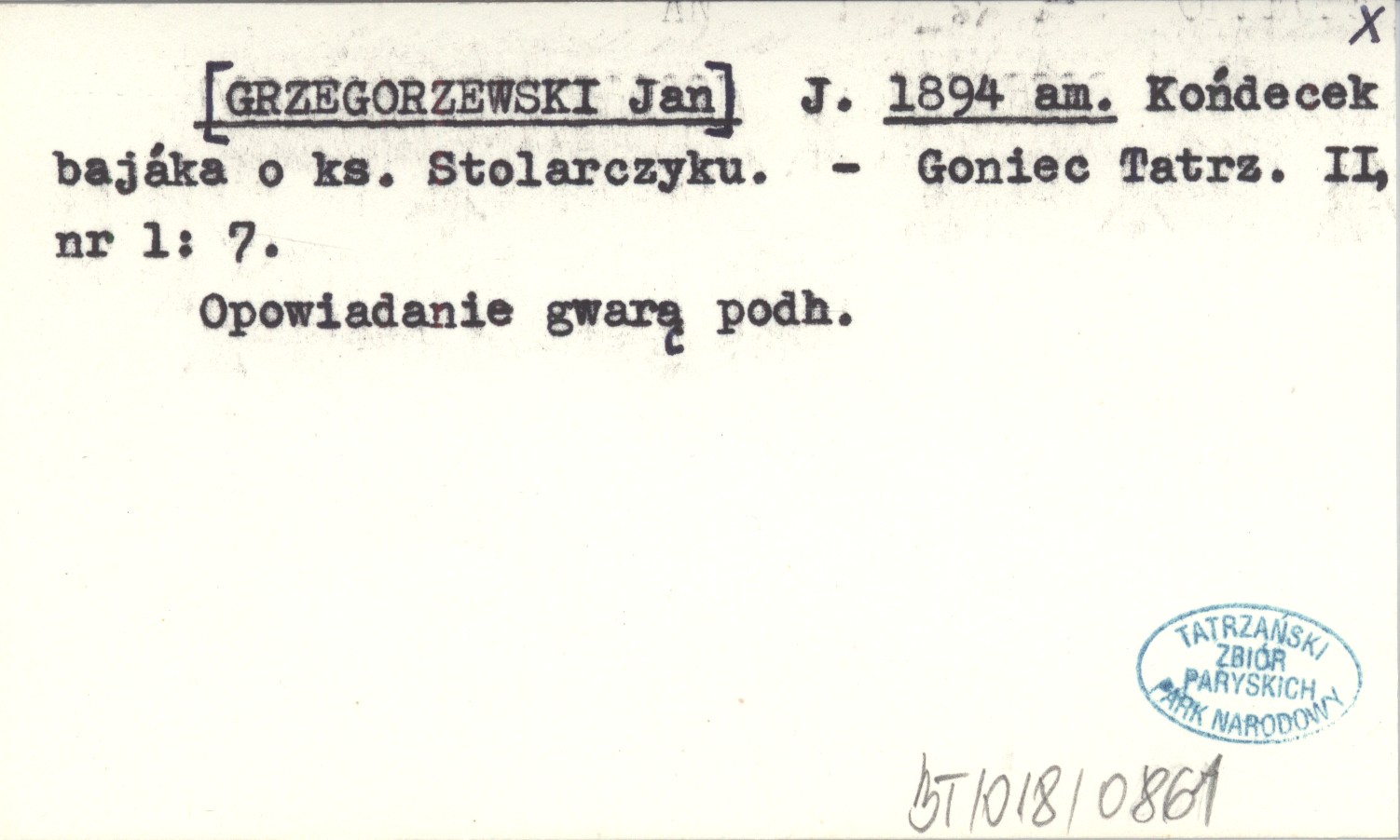 J. [GRZEGORZEWSKI Jan] 1894 am Końdecek bajáka o ks. Stolarczyku.