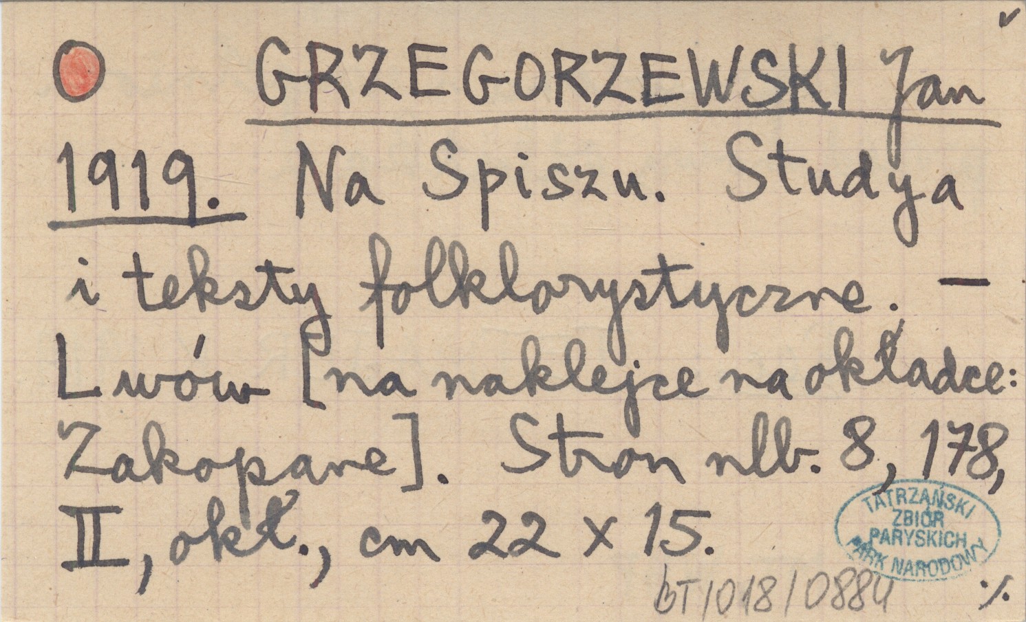 GRZEGORZEWSKI Jan 1919 Na Spiszu. Studya i teksty folklorystyczne.
