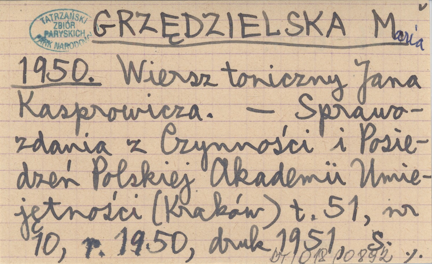GRZĘDZIELSKA Maria 1950 Wiersz toniczny Jana Kasprowicza.
