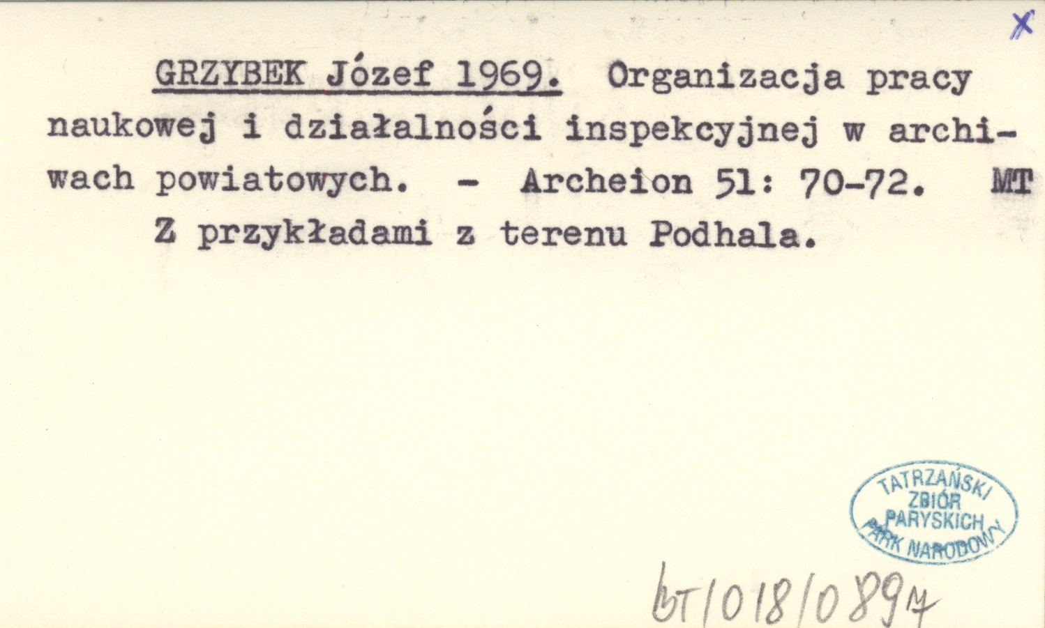 GRZYBEK Józef 1969 Organizacja pracy naukowej i działalności inspekcyjnej w archiwach powiatowych.