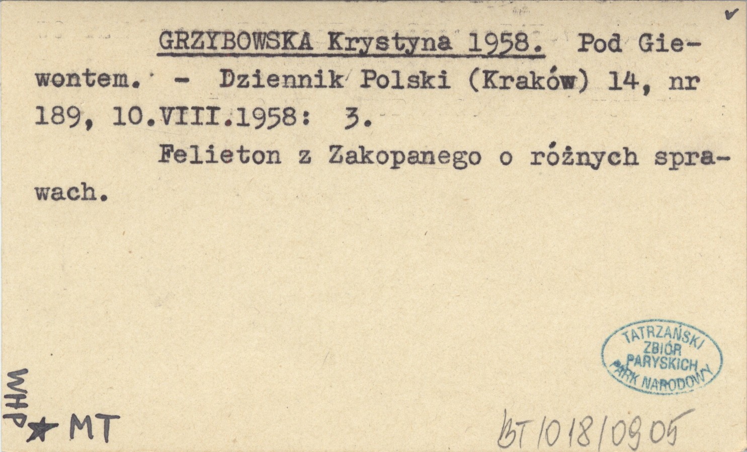 Dziennik Polski (Kraków) , 14, 10 VIII 1958, nr 189: 3. Felieton z Zakopanego o różnych sprawach.