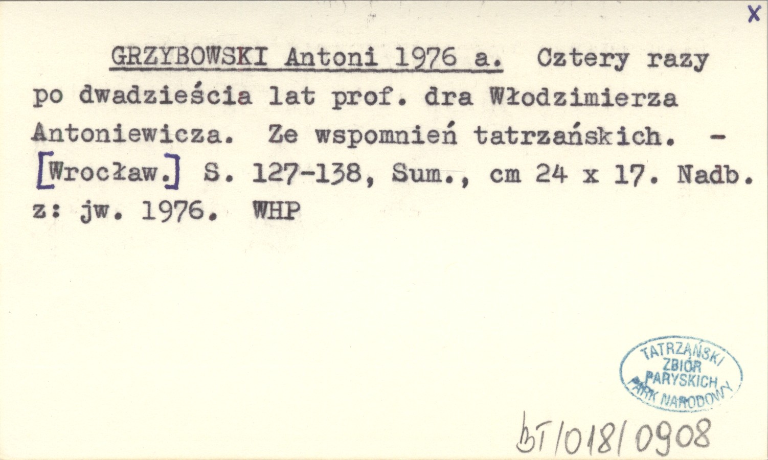GRZYBOWSKI Antoni 1976 a Cztery razy po dwadzieścia lat prof. dra Włodzimierza Antoniewicza. Ze wspomnień tatrzańskich.