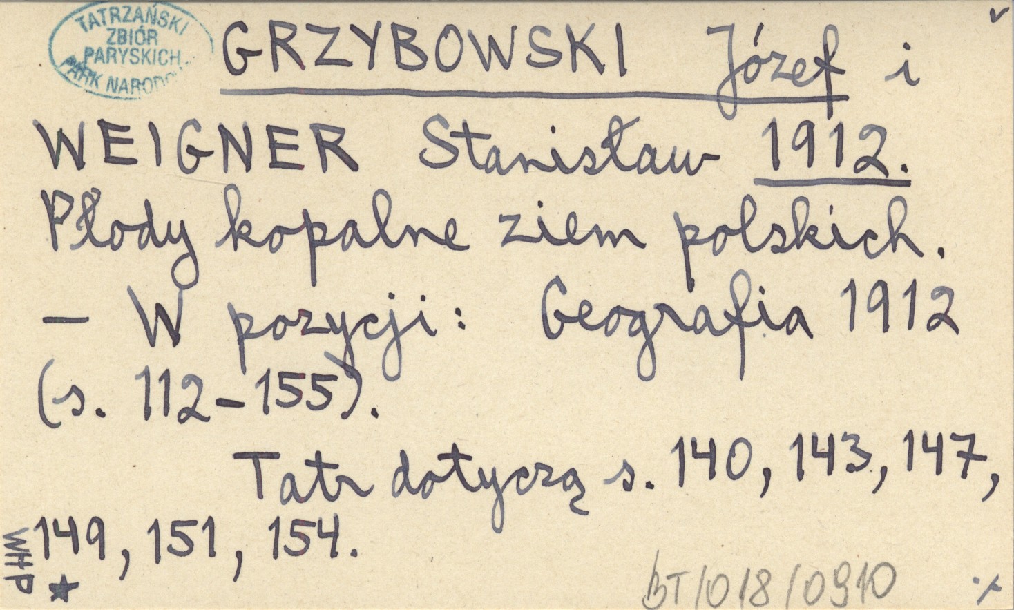 GRZYBOWSKI Józef WEIGNER, Stanisław. ; 1912 Płody kopalne ziem polskich.