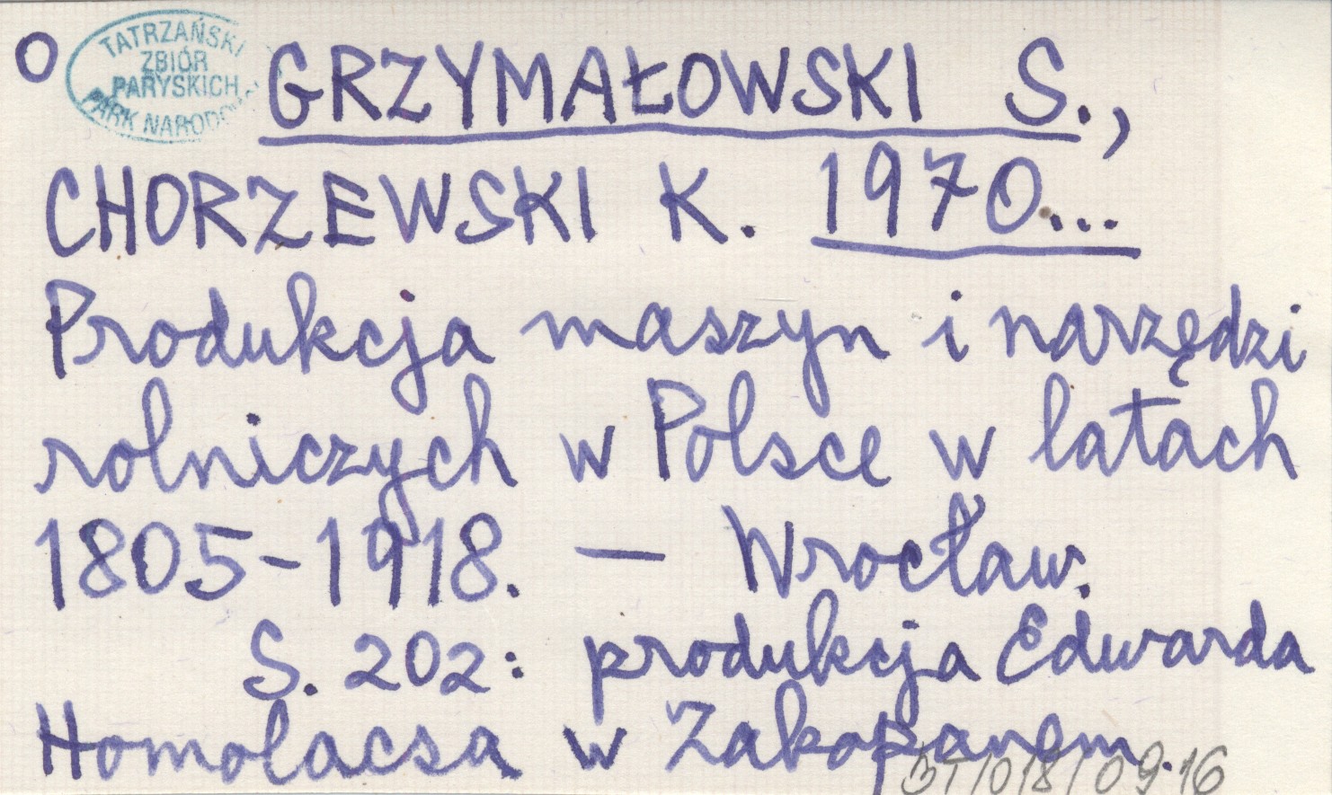 GRZYMAŁOWSKI S. CHORZEWSKI, K. ; 1970... Produkcja maszyn i narzędzi rolniczych w Polsce w latach 1805-1918.