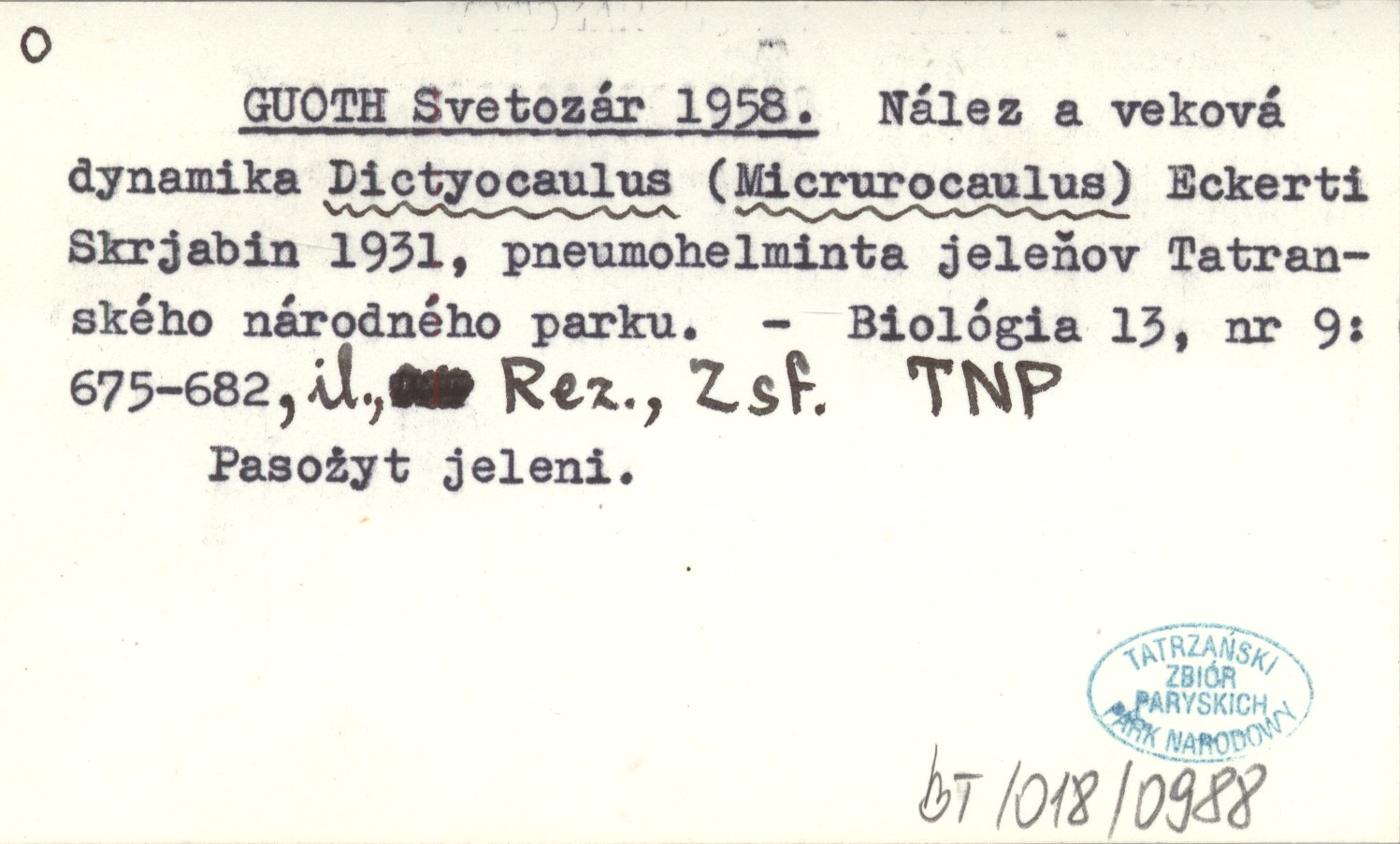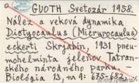 GUOTH Svetozár 1958 Nález a veková dynamika Dictyocaulus (Micrurocaulus) Eckerti Skrjabin 1931, pneumohelminta jeleňov Tatranského národného parku.