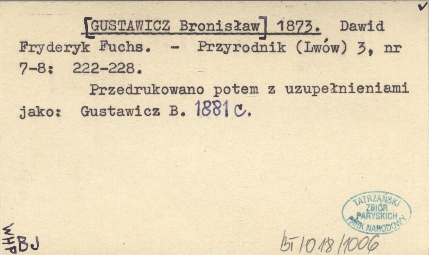 Przyrodnik (Lwów) , 3, nr 7-8: 222-228. Przedrukowano potem z uzupełnieniami jako: Gustawicz B. 1881 c