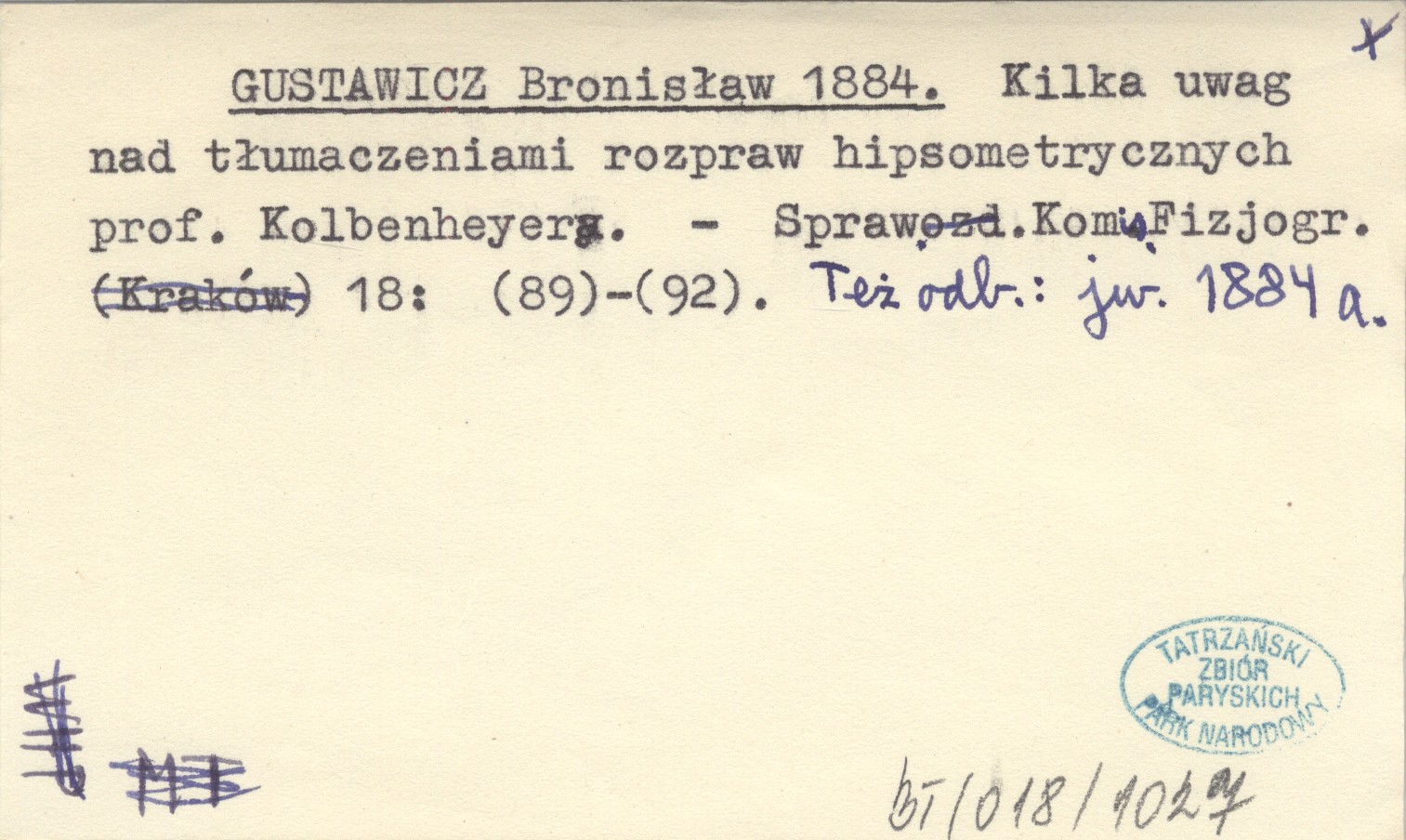 GUSTAWICZ Bronisław 1884 Kilka uwag nad tłumaczeniami rozpraw hipsometrycznych prof. Kolbenheyer.