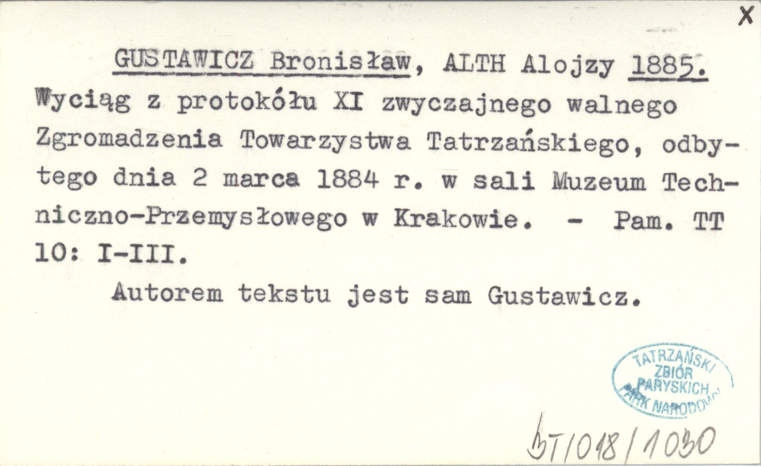 GUSTAWICZ Bronisław ALTH, Alojzy. ; 1885 Wyciąg z protokółu XI zwyczajnego walnego Zgromadzenia Towarzystwa Tatrzańskiego, odbytego dnia 2 marca 1884 r. w sali Muzeum Techniczno-Przemysłowego w Krakowie.