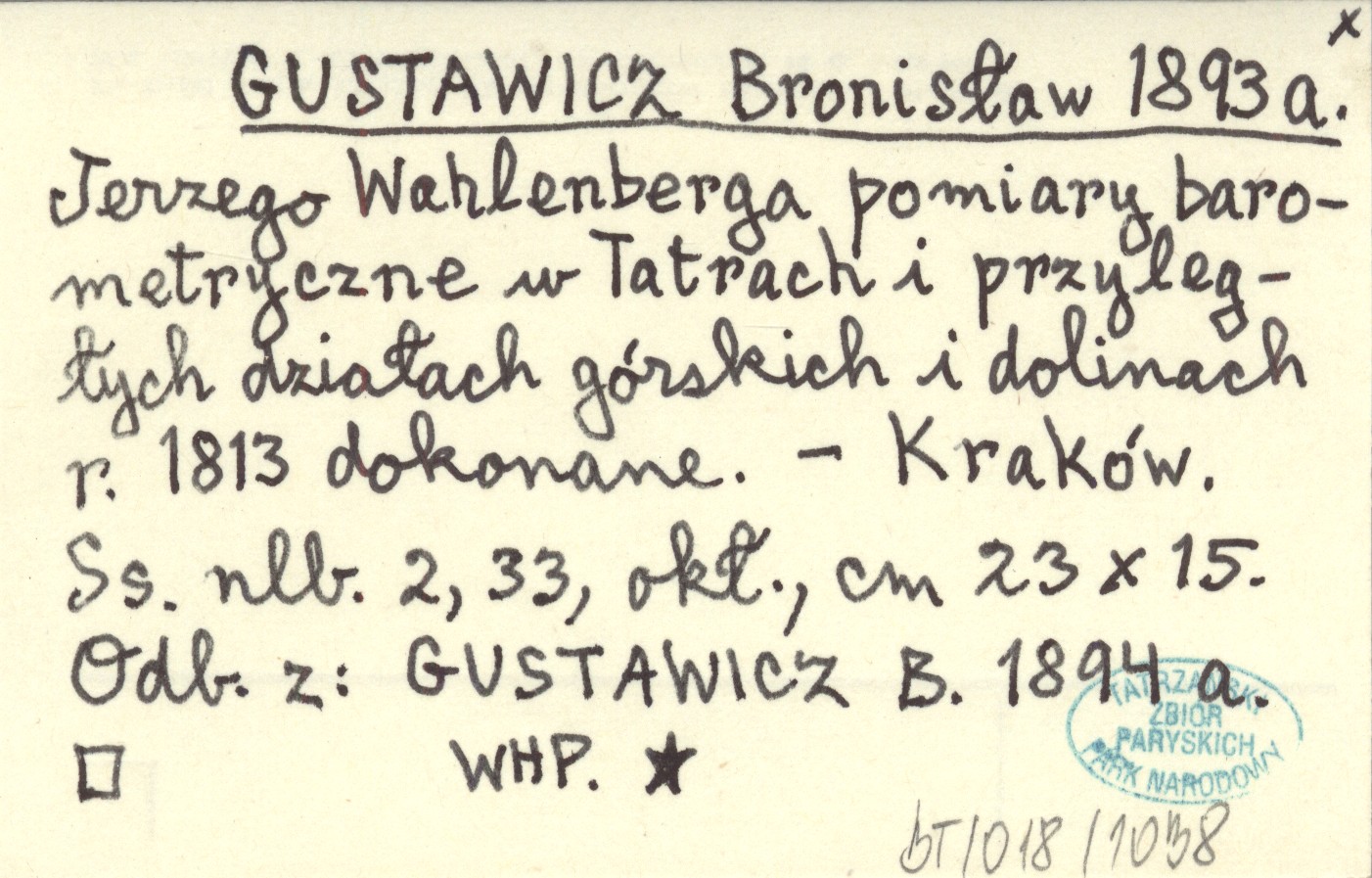GUSTAWICZ Bronisław 1893 a Jerzego Wahlenberga pomiary barometryczne w Tatrach i przyległych działach górskich i dolinach r. 1813 dokonane.