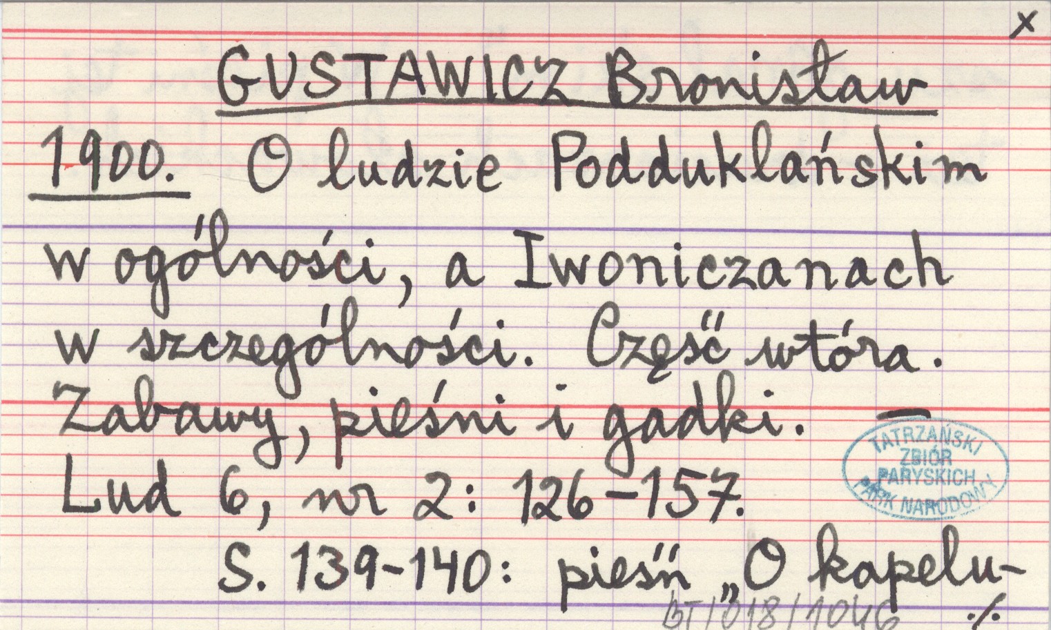 GUSTAWICZ Bronisław 1900 O ludzie Podduklańskim w ogólności, a Iwoniczanach w szczególności. Część wtóra. Zabawy, pieśni i gadki.
