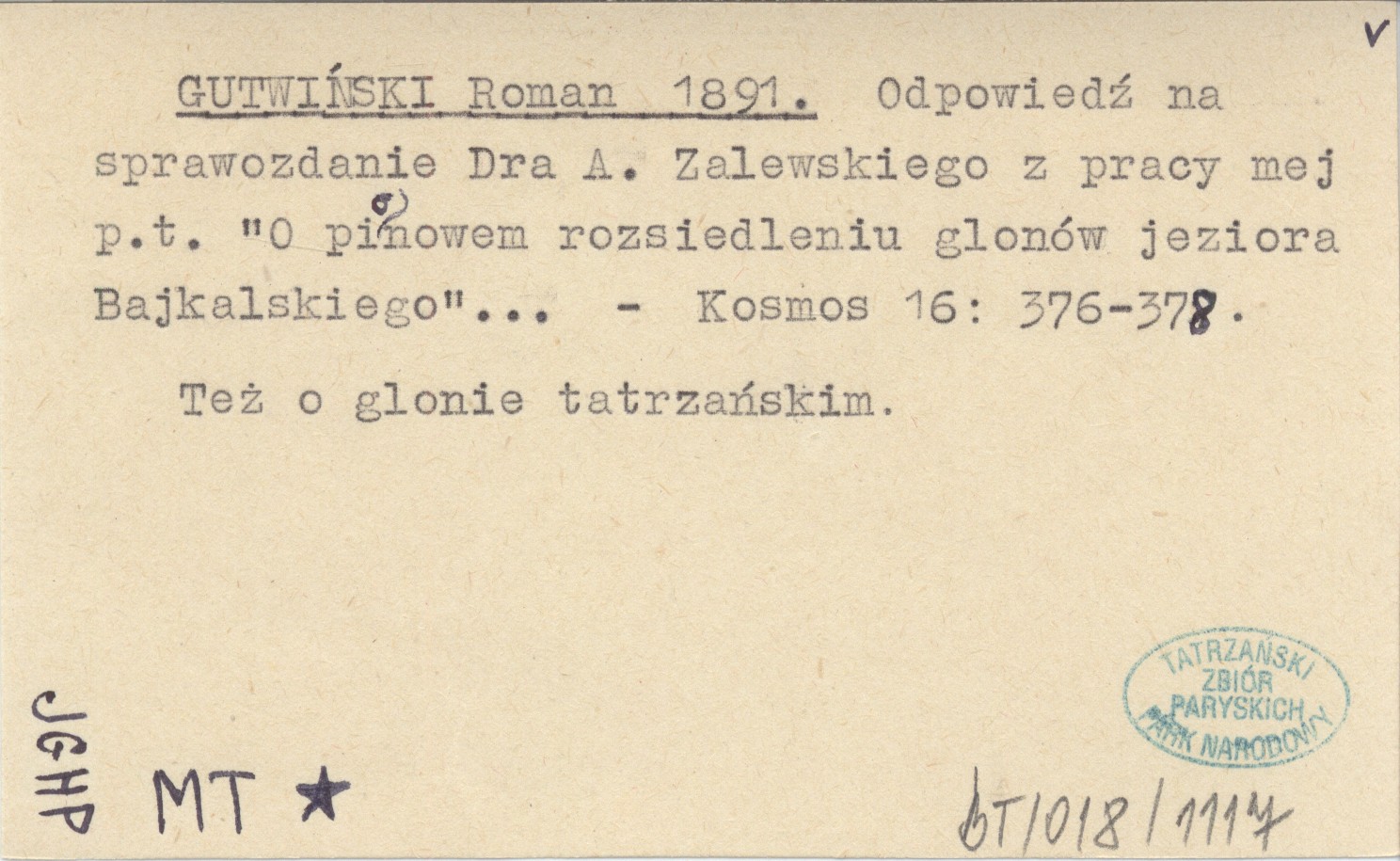 GUTWIŃSKI Roman 1891 Odpowiedź na sprawozdanie Dra A. Zalewskiego z pracy mej p.t. "O pionowem rozsiedleniu glonów jeziora Bajkalskiego"...
