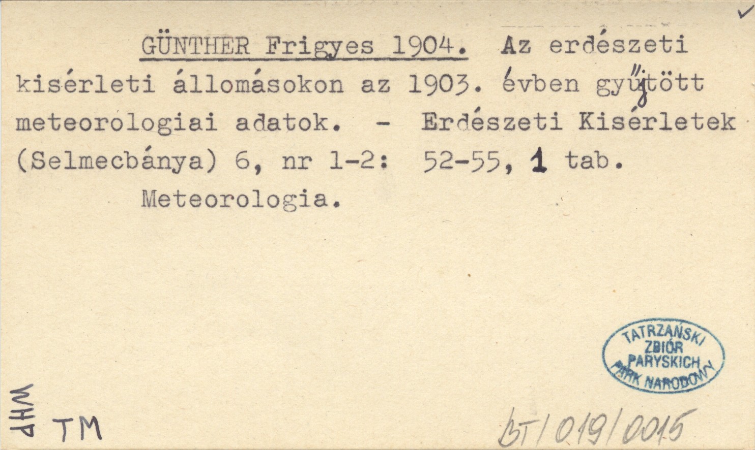 GÜNTHER Frigyes 1904 Az erdészeti kisérleti állomásokon az 1903. évben gyűjtött meteorologiai adatok.