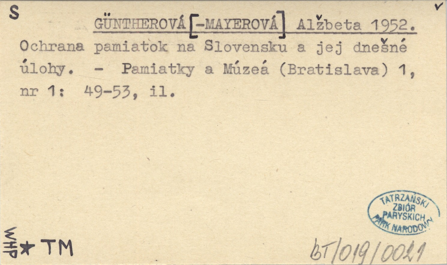 GÜNTHEROVÁ[-MAYEROVÁ] Alžbeta 1952 Ochrana pamiatok na Slovensku a jej dnešné úlohy.