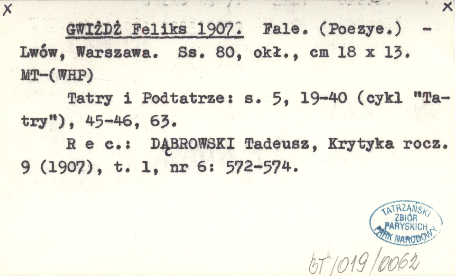Lwów, Warszawa , 80 s., okł., 18x13 cm. Tatry i Podtatrze: S. 5, 19-40 (cykl "Tatry"), 45-46, 63. REC: DĄBROWSKI Tadeusz, Krytyka R. 9 (1907), t. 1, nr 6: 572-574.