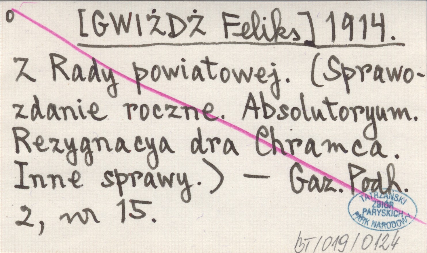 [GWIŻDŻ Feliks] 1914 Z Rady powiatowej. (Sprawozdanie roczne. Absolutoryum. Rezygnacya dra Chramca. Inne sprawy).
