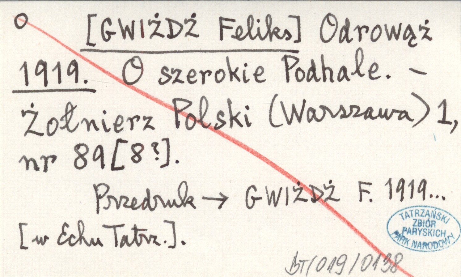 Żołnierz Polski (Warszawa) , 1, nr 89 [8?]. Przedruk: GWIŻDŻ F. 1919... [w Echu Tatrzańskim].