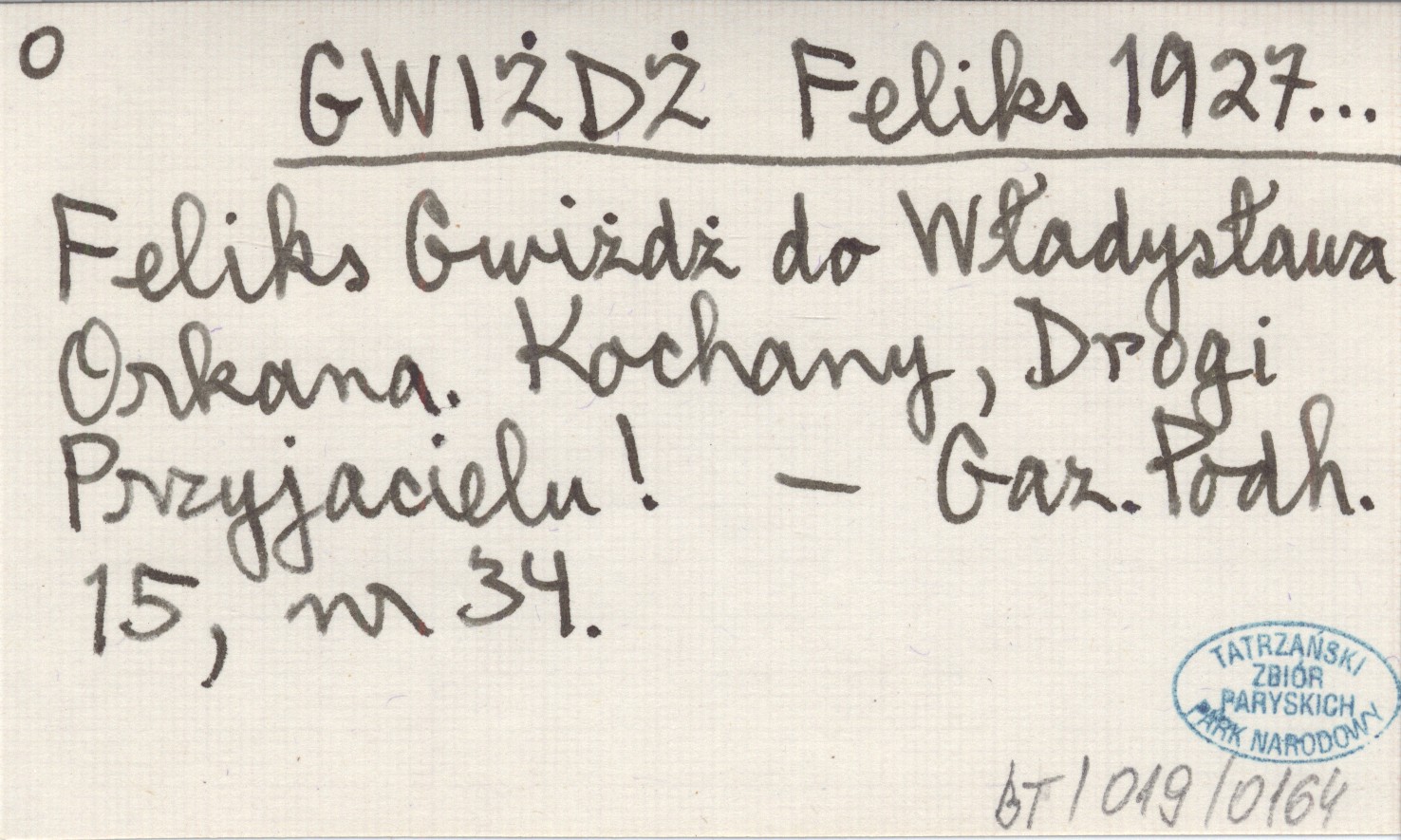 GWIŻDŻ Feliks 1927... Feliks Gwiżdż do Władysława Orkana. Kochany, Drogi Przyjacielu!.