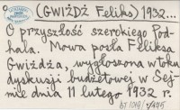 (GWIŻDŻ Feliks) 1932... O przyszłość szerokiego Podhala. Mowa posła Feliksa Gwiżdża, wygłoszona w toku dyskusji budżetowej w Sejmie dnia 11 lutego 1932 r.
