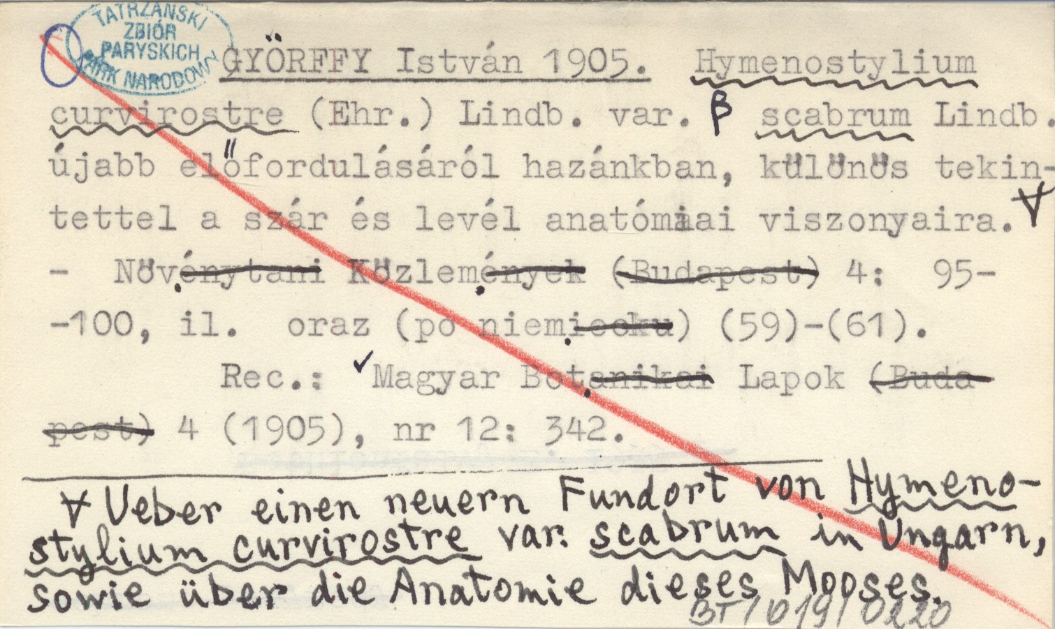GYŐRFFY István 1905 Hymenostylium curvirostre (Ehr.) Lindb. var. ß scabrum Lindb. újabb előfordulásáról hazánkban, különös tekintettel a szár és levél anatómiai viszpnyaira. Ueber einen neuern Fundort von Hymenostylium curvirostre var. scabrum in Ungarn, sowie über die Anatomie dieses Mooses.