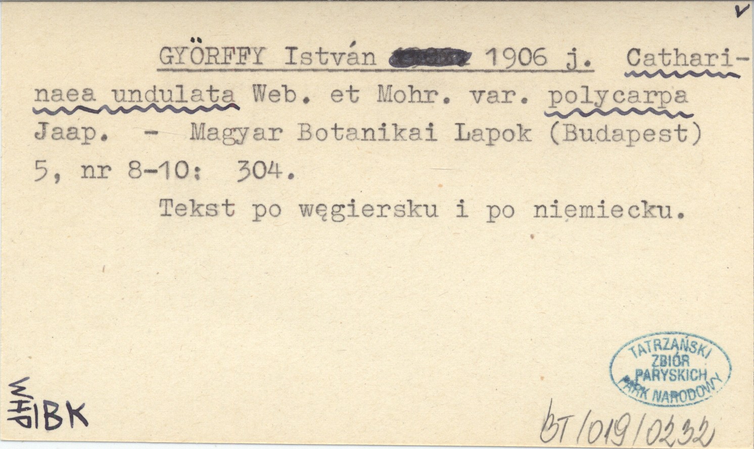 GYŐRFFY István 1906 j Catharinaea undulata Web. et Mohr. var. polycarpa Jaap.