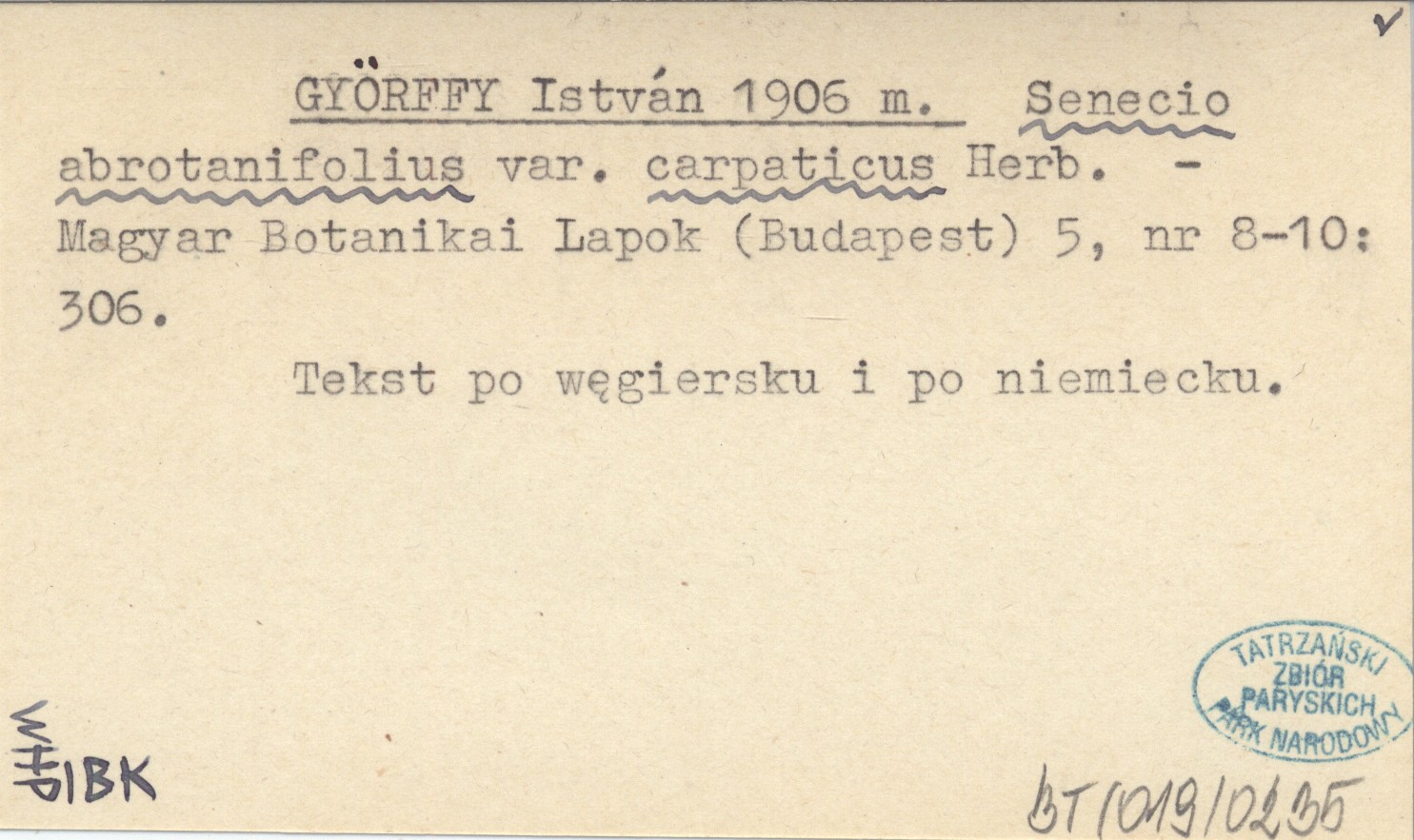 GYŐRFFY István 1906 m Senecio abrotanifolius var. carpaticus Herb.