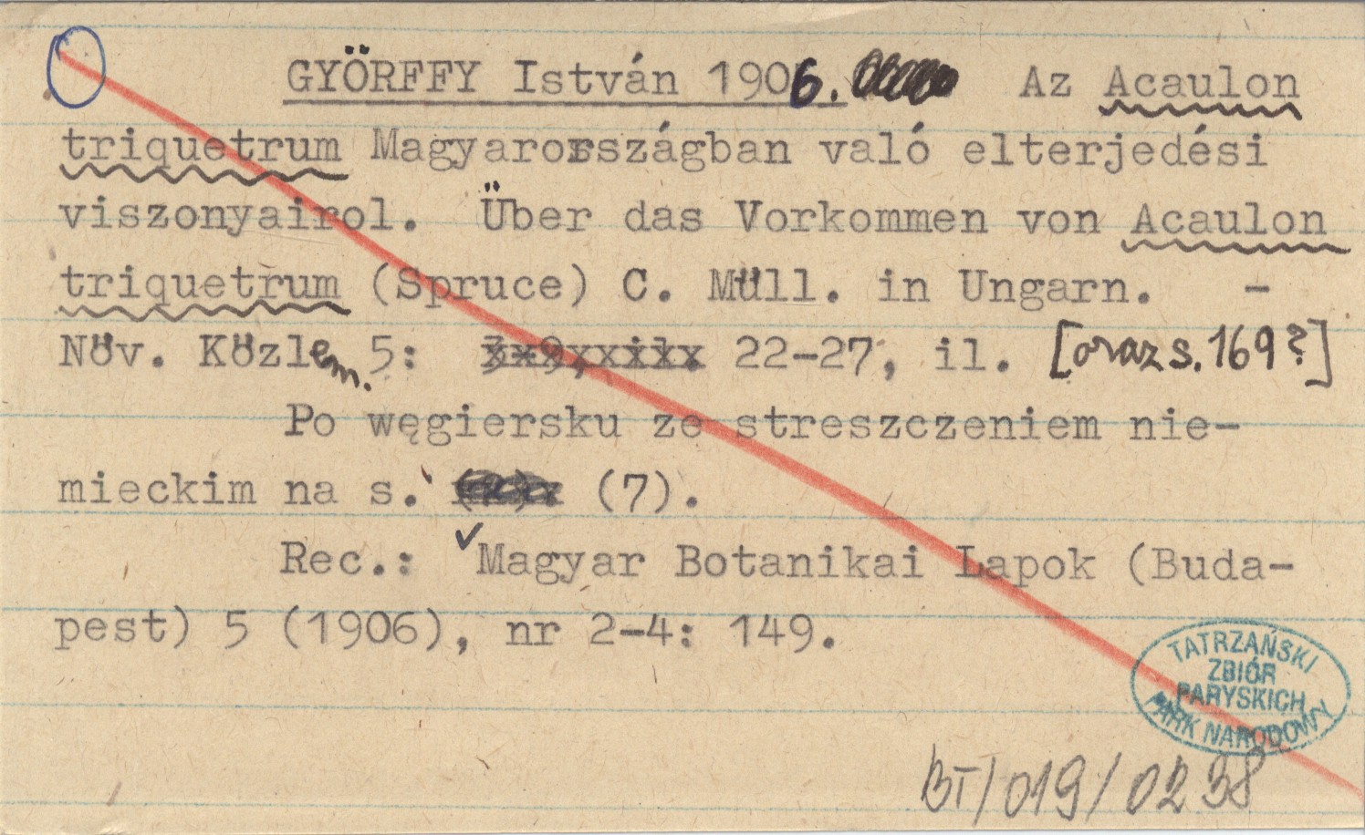GYŐRFFY István 1906 Az Acaulon triquetrum Magyarországban való elterjedési viszonyairol. Über das Vorkommen von Acualon triquetrum (Spruce) C. Müll. in Ungarn.