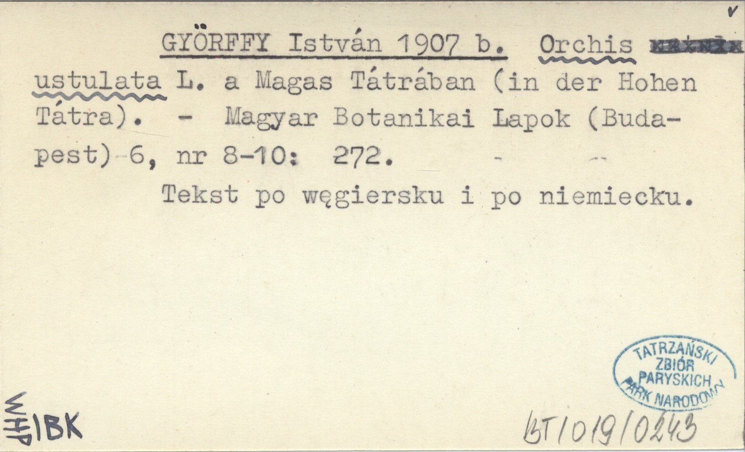 GYŐRFFY István 1907 b Orchis ustulata L. a Magas Tátrában (in der Hohen Tátra).