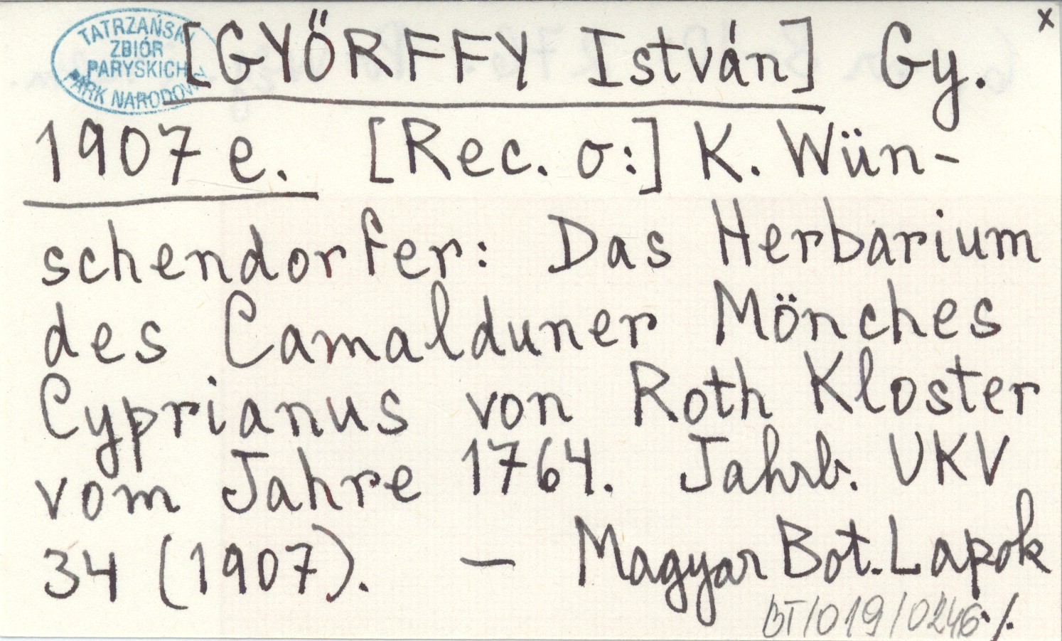 Gy. [GYŐRFFY István] 1907 e [Rec. o:] K. Wünschendorfer: Das Herbarium des Camalduner Mönches Cyprianus von Roth Kloster vom Jahre 1764. Jahrb. UKV 34 (1907).