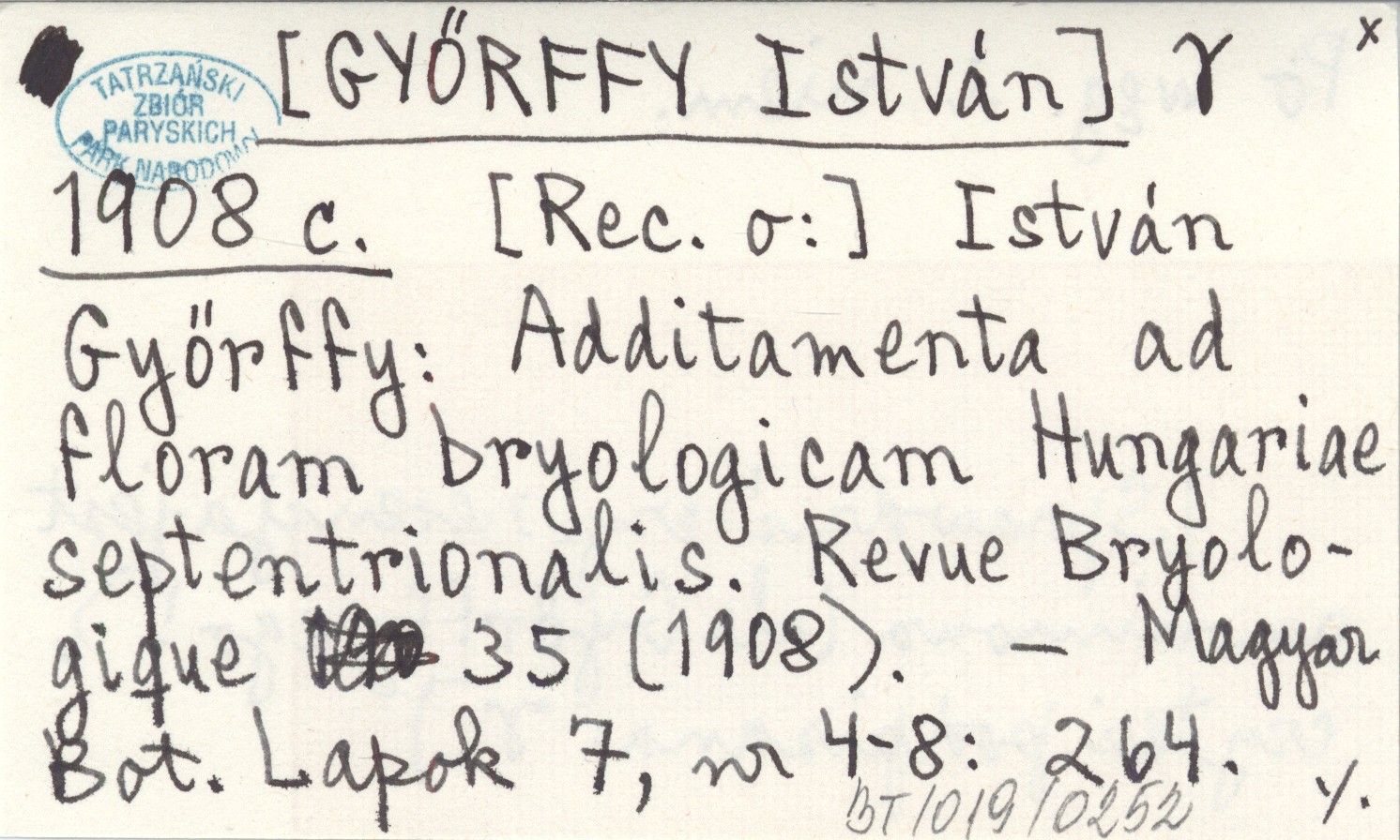Ɣ [GYŐRFFY István] 1908 c [Rec. o:] István Györffy: Additamenta ad floram bryologicam Hungraiae septentrionalis. Revue Bryologique 35 (1908).
