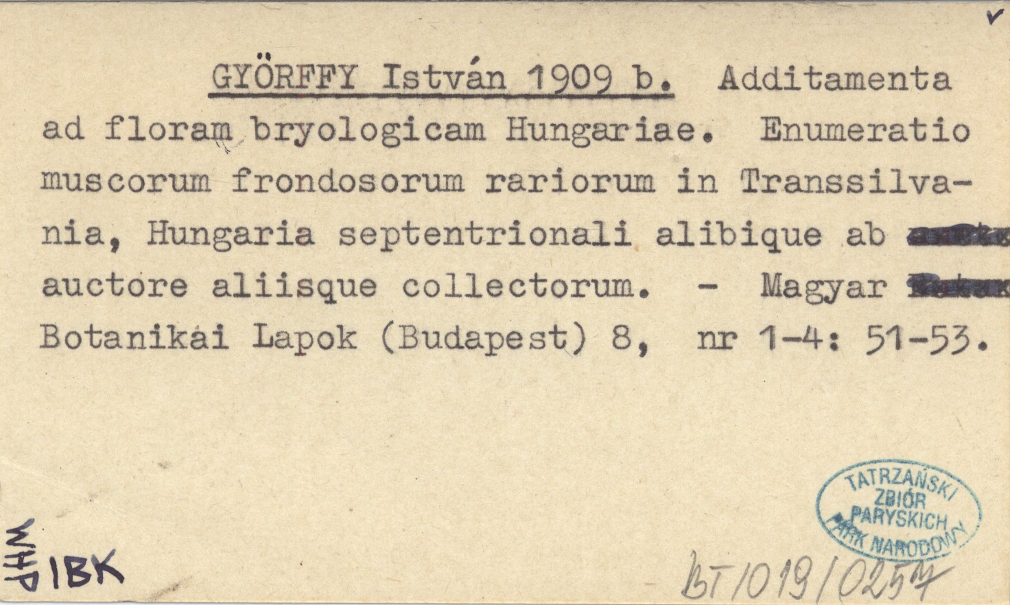 GYŐRFFY István 1909 b Additamenta ad floram bryologicam Hungariae. Enumeratio muscorum frondosorum rariorum in Transsilvania, Hungaria septentrionali alibique ab auctore aliisque collectorum.