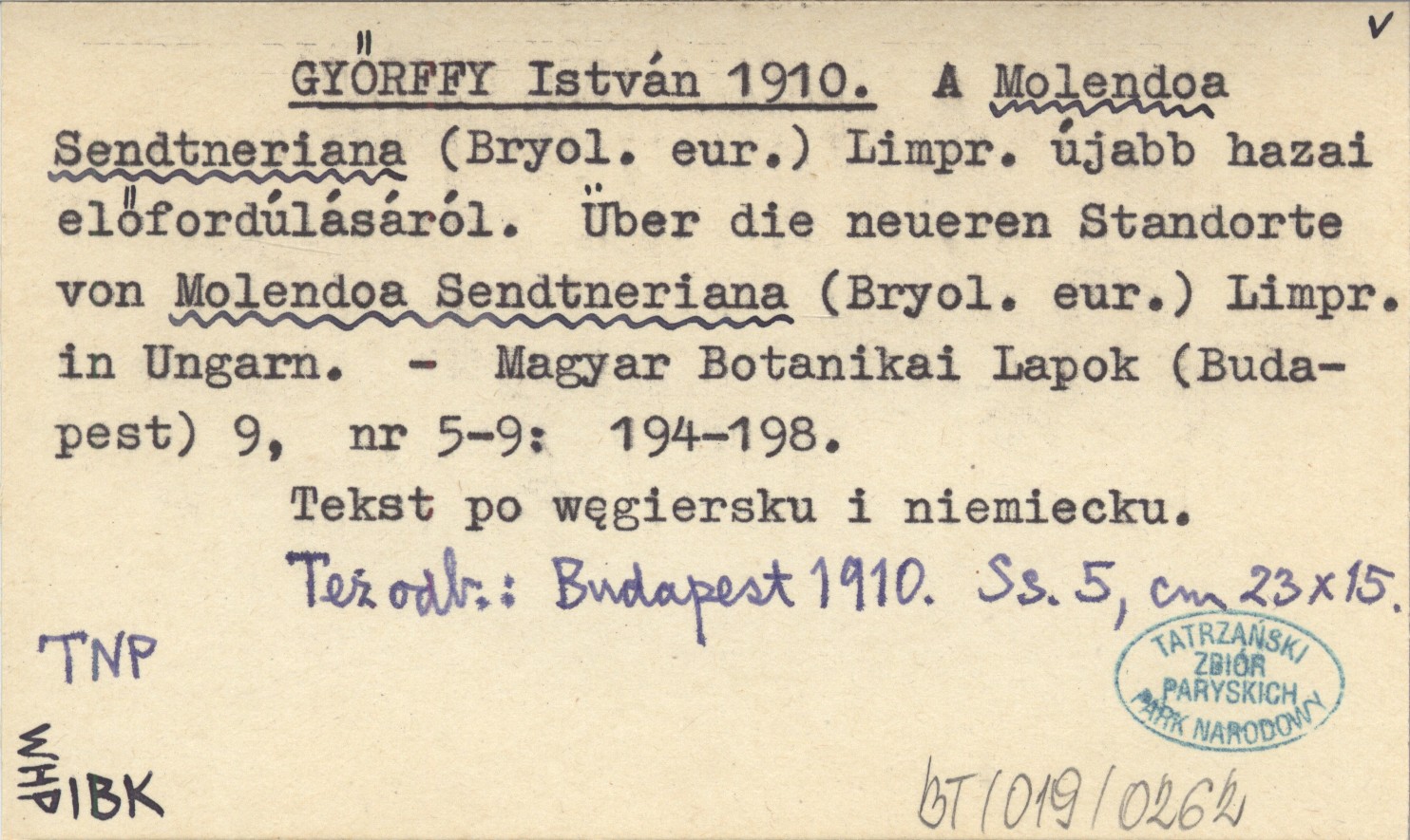 GYŐRFFY István 1910 A Molendowa Sendtneriana (Bryol. eur.) Limpr. újabb hazai előfordúlásáról. Über die neueren Standorte von Molendoa Sendtneriana (Bryol. eur.) Limpr. in Ungarn.