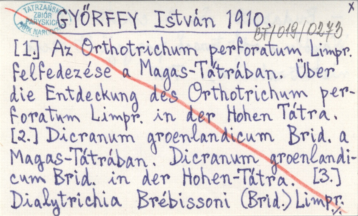 GYÕRFFY István 1910 [1.] Az Orthotrichu, perforatum Limpr. felfedezése a Magas Tétrában. Über sie Entdeckung des Orthotrichum perforatum Limpr. in der Hohen Tátra. [2.] Dicranum groenlandicum Brid. a Magas-Tátrában. Dicranum groenlandicum Brid. in der Hohen-Tátra. [3.] Dialitricha Brébissoni (Brid.) Limpr