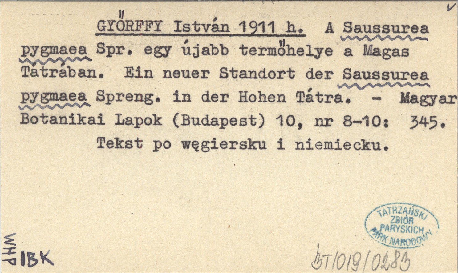 GYŐRFFY István 1911 h A Saussurea pygmaea Spr. egy újabb termőhelye a Magas Tátrában. Ein neuer Standort der Saussurea pygmaea Spreng. in der Hohen Tátra.