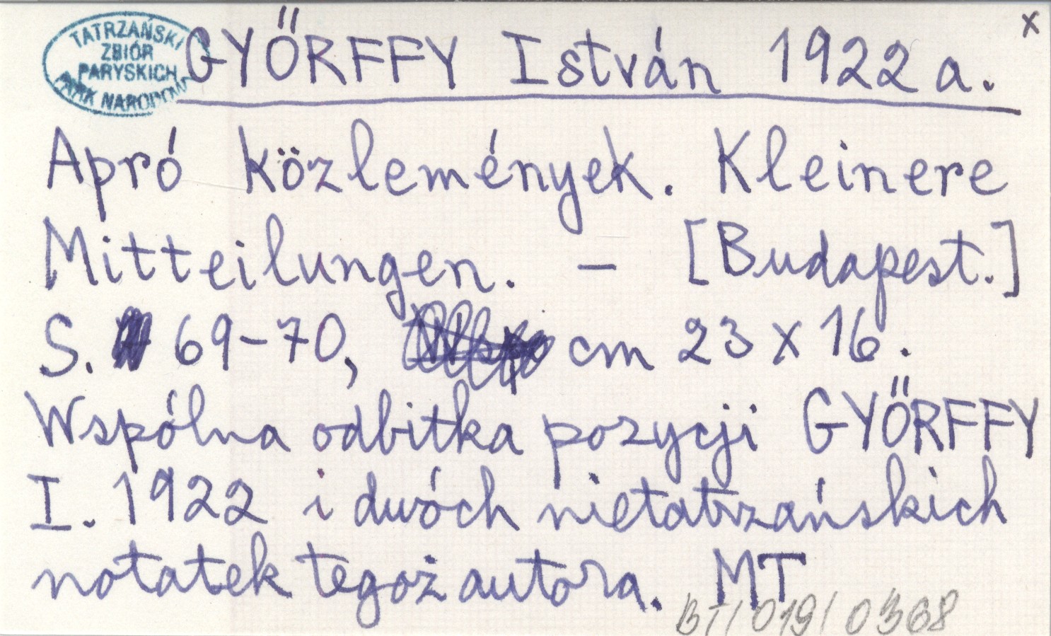 [Budapest] , S. 69-70, 23x16 cm. Wspólna odbitka pozycji GYŐRFFY I. 1922 i dwóch nietatrzańskich notatek tegoż autora.