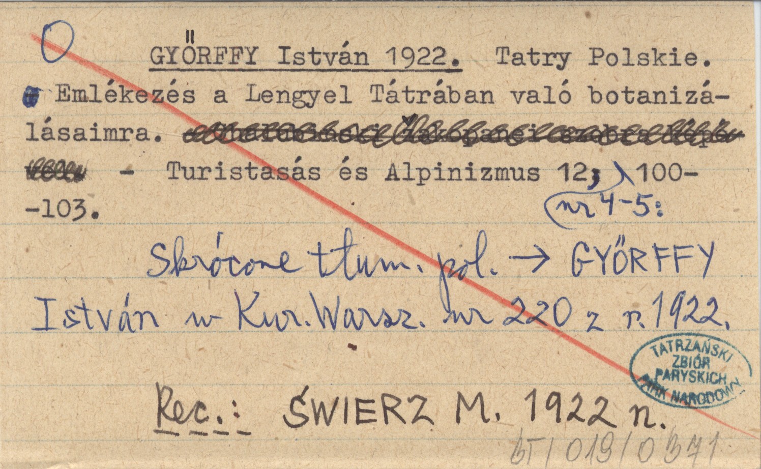 Turistaság és Alpinizmus, 12, nr 4-5: 100-103. Skrócone t³umaczenie polskie: GYÕRFFY István w Kurierze Warszawskim nr 220 z r. 1922. REC: ¦WIERZ M. 1922 n.